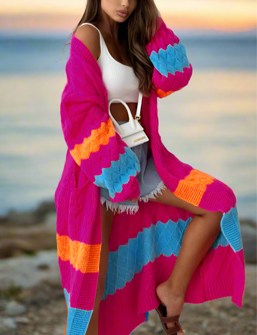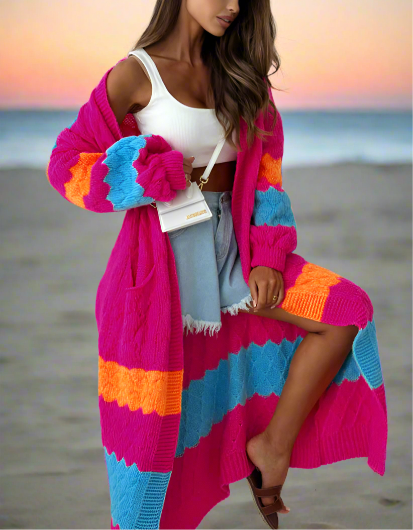 This long hot pink cardigan offers a cool vibrant style. Perfect for any fun beach occasion, stay warm and comfy while looking effortlessly beautiful!